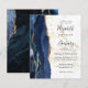 The left-hand edge of this elegant modern wedding invitation features a navy blue watercolor agate border trimmed with faux gold glitter. The customisable text combines dark navy blue handwriting script with black copperplate and italic fonts on a white and gold marble background. The reverse side features a matching navy blue and gold agate design.