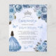 This lovely quinceañera invitation features a border of blue roses with silver faux glitter foliage on a blue watercolor background. A silver tiara, a dark-haired girl in a blue princess dress and small blue butterflies decorate the text. The word "Quinceañera" and the name of the guest of honour appear in elegant blue handwriting script, with the remaining text in grey sans serif font. Add additional text on the back, along with a QR code to help your guests visit your quinceañera website and RSVP online.