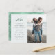 This minimalist wedding design is perfect for that modern couple looking for something unique. This budget invitation features a watercolor branch with gorgeous modern typography underneath and your own custom photo on the right-hand side against a pastel blue background. On the back, there is a green watercolor wash to perfectly complement the front. Click the blue "personalise" button to add your own details and watch your design come to life in front of you!
