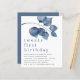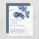 Blue Modern Foliage Twenty First Invite. A budget friendly SMALLER 4.5” x 5.6” alternative. Available in a SEMI GLOSS 110 lb CARD STOCK or a SATIN FINISH 80 lb THINNER PAPER STOCK. Envelopes are an optional extra. Informal style. Modern large watercolor deep blue leaves decorate the top and the heading is large below in stylish lowercase with the details at the bottom. Easily personalise the text to your own details.