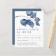 Blue Watercolor Foliage Wedding RSVP. A budget friendly PAPER smaller 4.5” x 5.6” paper alternative. Envelopes are an optional extra. Informal style. Modern large watercolor deep blue leaves decorate the top and your names are large below in stylish lowercase with the details at the bottom. Easily personalise the text to your own details.