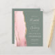 The left-hand edge of this elegant modern wedding invitation features a blush pink watercolor agate border trimmed with faux gold glitter. The customisable text combines pale blush handwriting, copperplate and italic fonts on a deep sage green background. The reverse side provides space for wedding details on a solid sage green background, along with a QR code guests can scan to visit your website and RSVP, which saves the cost of printing and mailing separate RSVP