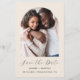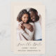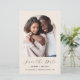 This simple, minimalist Save the Date card features a photo arch above the words "Save the Date" in elegant black handwriting script, followed by the couple's names, wedding date and city in sans serif font on a beige background. Add a more detailed message with additional information on the reverse.