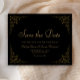 This elegant vintage-inspired formal wedding save the date card features the text in gold coloured script and serif fonts, framed by a delicate vintage gold vine motif on a black background. The frame is repeated on the reverse.