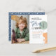 A budget-friendly birthday party invitation featuring a hand-drawn dinosaur holding a balloon. Inside the balloon is the birthday boy's age. The invite text is rotated and aligned to the left for a fun layout. The top of the invite reads "Stomp, chomp & roar. Let's party like a dinosaur!". Below, your little one's name is written in a handwriting-style font. The party information is written at the bottom with extra space for a custom message. On the left-hand side of the card, there is a photo of your choice. Dividing the photo and the design, there is a brushed white line. Cards reverse to a pattern of organic shapes against a blue background. The colour palette of this design is blue, orange, and green. Perfect for any age child! Colourful dinosaur-themed birthday invitations. A standard invitation version of this design is available in my store. Please note, as this is on Zazzle's budget paper option, we only recommend the semi-gloss finish. Feel free to message me with any questions - I'll be happy to help!