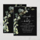 Budget Brunch and Bubbly Eucalyptus Black Greenery Succulent Botanical Watercolor Emerald Green Spring Wedding Bridal Shower Invitations on white background - includes beautiful and elegant script typography with modern botanical leaves and greenery for the special Bride to Be celebration.