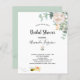 An invitation for a bride to bee. A chic white background. Decorated with white watercolored florals flowers (peony) eucalyptus greenery, leaves and sprigs, and a cute happy smiling bee carrying an envelope. Personalise and add a name and party details. Black letters. The text: Bridal Shower and the name of the bride to bee are written with a modern hand lettered style script.