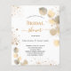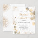 A white background decorated with golden eucalyptus and faux gold glitter dust. Personalise and the name of the bride to be and party details. Black and golden coloured letters.