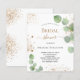 A white background decorated with eucalyptus greenery and faux gold glitter dust. Personalize and the name of the bride to be and party details. Black and golden colored letters.