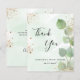 A bridal shower thank you card. A green watercolored background decorated with eucalyptus greenery and faux gold glitter dust. On front large black coloured hand lettered script and the text: Thank You, your text, title and a date.