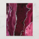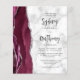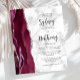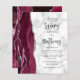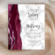The left-hand edge of this elegant modern wedding invitation features a burgundy watercolor agate border trimmed with silver faux glitter. The customisable text combines black calligraphy script and sans serif font on a grey and white marble background. The reverse side features a matching burgundy and silver agate design.