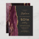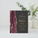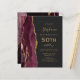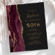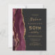 The left-hand edge of this elegant modern 50th birthday party invitation features a burgundy watercolor agate border trimmed with gold faux glitter. The customisable text combines gold-coloured handwriting, copperplate and italic fonts on a slate black background. The reverse side features a matching burgundy and gold agate design.