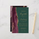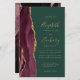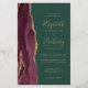 The left-hand edge of this elegant modern wedding invitation features a burgundy watercolor agate border trimmed with faux gold glitter. The customizable text combines gold-colored handwriting, copperplate and italic fonts on an emerald green background. The reverse side features a matching burgundy and gold agate design.