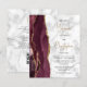 The left-hand edge of this elegant modern wedding invitation features a burgundy watercolor agate border trimmed with faux gold glitter. The customisable text combines trendy gold-coloured script and black sans serif fonts on a grey and white marble background. The reverse side provides space for wedding details on a marble background, along with a QR code guests can scan to visit your website and RSVP, which saves the cost of printing and mailing separate RSVP cards.