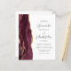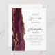 The left-hand edge of this elegant modern wedding invitation features a burgundy red watercolor agate border trimmed with faux gold glitter. The customisable text combines charcoal grey script and sans serif fonts on a white background. The reverse side provides space for wedding details on a solid white background, along with a QR code guests can scan to visit your website and RSVP, which saves the cost of printing and mailing separate RSVP cards.