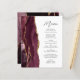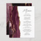 The left-hand edge of this elegant modern wedding menu features a burgundy red watercolor agate design trimmed with faux gold glitter. The customisable text combines charcoal grey handwriting script and sans serif fonts on a white background. The burgundy and gold agate design is repeated on the reverse side.