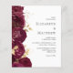 This romantic floral wedding invitation features a border of burgundy flowers set off with gold faux foil foliage. The names of the couple appear in classic charcoal grey serif font, with the remaining text in italics.