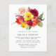 Elegant fall flower bouquet tops this pretty autumn wedding invitation. Burgundy red, blush pink, bright yellow and orange flowers are nestled in green foliage and leaves. The rustic arrangement pops against the white background. The simple text creates a modern design. This invitation is part of the Always collection that contains the DIY templates you need to create a unique wedding invitation suite and reception.