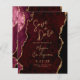This elegant wedding save the date card features a background image of burgundy red watercolor agate trimmed with faux gold glitter. The customisable text combines gold-coloured modern handwriting, copperplate and italic fonts. The reverse side features a coordinating burgundy and gold agate design.