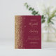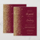 The left-hand edge of this elegant modern wedding invitation features a gold faux glitter border. The customisable text combines gold-coloured handwriting, copperplate and italic fonts on a burgundy red background. The reverse side features a matching burgundy red and gold design.