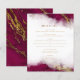This elegant modern wedding menu features a burgundy red watercolor marble border trimmed with faux gold foil. The customisable text combines gold-coloured script with serif font. The reverse side features a matching burgundy and gold marble design.
