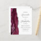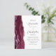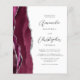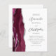 The left-hand edge of this elegant modern wedding invitation features a burgundy red watercolor agate border trimmed with faux silver glitter. The customisable text combines charcoal grey script and sans serif fonts on a white background. The reverse side provides space for wedding details on a solid white background, along with a QR code guests can scan to visit your website and RSVP, which saves the cost of printing and mailing separate RSVP cards.