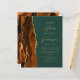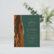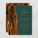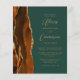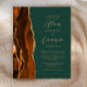 The left-hand edge of this elegant modern wedding invitation features a burnt orange watercolor agate border trimmed with faux gold glitter. The customisable text combines gold-coloured script and sans serif fonts on a dark emerald green background. The reverse side features a matching burnt orange and gold agate design.