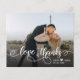 Budget Modern Hand Lettered Wedding "Love and Thanks" Calligraphy Script Photo Thank You Cards. Modern Stylish wedding thank you card template featuring a full horizontal photo on the front with overlay text "Love and Thanks" in a swirly hand written typography script font with swashes in white on the picture. Add your custom names and thank you message. If you prefer to handwrite your note, just delete the sample text to make more space. Pretty, elegant low cost cheap cards. If You need help, please contact designer!