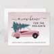 A rose gold and blush car with a teal Christmas tree tied on top lets family and friends know that you've moved during the holidays. Created with boss ladies in mind, this feminine style glitter ombre budget moving announcement lets you combine your annual Christmas greeting with your new address information. On front of the card, the example text says, "A new home for the holidays" in coordinating sans serif and elegant script typography. On back of the card is text you can revise with your new contact info and a heartfelt holiday greeting. All text can be changed easily on the personalisation template.