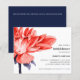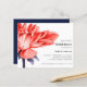Stunning and Elegant Bridal shower invitation, featuring a magnificent Dahlia Flower in bloom in watercolor palette of rich orange red nuances and blue purple leaves on left of the card.