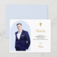 A modern and elegant confirmation thank you card for him. A chic white background decorated with a golden cross. Personalise and add your photo, thank you note and name. Arch photo frame.