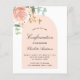 A white background decorated with eucalyptus greenery, a rose gold and blush pink rose, and golden leaves and a rose gold arch frame. Personalise and a name and ceremony details. Hand lettered style script.