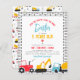 Budget construction-themed boy birthday party invitations. Celebrate your little one's special day with this modern building trucks birthday invite! A fun birthday party invitation template for a construction-themed birthday party! This design features three construction vehicles: a tractor, a digger, and a cement truck along the bottom of the card. The invite reads "Stop the traffic, close the road!" with the birthday boy's name and age ending in "years old!" to rhyme! Below, there is a mini stop sign separating the event details from the top of the text. The event details are written in big, bold capitals, with a custom message (we have chosen "looking forward to seeing you!") at the bottom. Behind the typography, there is a brick pattern around the edge of the card to fit with the building theme! The color scheme is a bright mix of red, blue, and yellow. Cards reverse to a pattern of other construction vehicles, cranes, dump trucks, bulldozers, excavators, and even a few little trees! Kids party invites that are perfect for any age, 1st, 2nd, 3rd, 4th, 5th, 6th, and even 7th or 8th! There is a standard invitation version of this design available in our store. This is a budget paper option and we only recommend the semi-gloss finish. To customize these cards, click on "Personalize" and edit the text in the boxes provided. For more advanced edits, scroll to "Customize further" and use Zazzle's easy-to-use design tool to make these cards uniquely yours! Feel free to message me with any questions or custom order requests - I'll be happy to help!