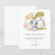 A budget price SMALLER 4.5” x 5.6” alternative. Available in a SEMI-GLOSS 110 lb CARD STOCK which is the default option (thicker for invitations), OR a SATIN FINISH 80 lb THINNER PAPER STOCK (ideal for enclosures). Envelopes are an optional extra and are slightly larger than the card size. Say thank you after your baby shower with safari cuteness with this adorable elephant with florals, foliage, tree and balloons. Easily personalise with your own words of thanks and name. A white background is on both sides. You also change the fonts and text and background colours if you wish via the Click to Customise Further option.