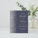 The left-hand edge of this elegant modern wedding invitation features a silver faux glitter border. The customizable text combines pale silver gray handwriting, copperplate and italic fonts on a dark blue background. The reverse side features a matching dark blue and silver design.