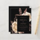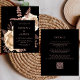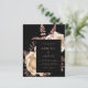 This elegant, moody wedding invitation features a lush, romantic floral bouquet in ivory with rose gold faux foil and glitter foliage on a black background. Customise the rose pink text in stylish fonts on a black rectangle. The reverse side provides space for wedding details on a solid black background, along with a QR code guests can scan to visit your website and RSVP, which saves the cost of printing and mailing separate RSVP cards.