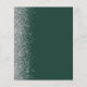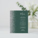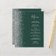 The left-hand edge of this elegant modern wedding menu features a silver faux glitter border. The customisable text combines silver grey handwriting script and copperplate fonts on a dark emerald green background. The reverse side features a matching green and silver design.