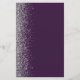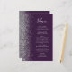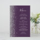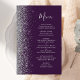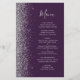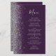 The left-hand edge of this elegant modern wedding menu features a silver faux glitter border. The customisable text combines silver grey handwriting script and copperplate fonts on a dark purple background. The reverse side features a matching dark purple and silver glitter design.