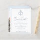 This budget minimalist nautical wedding save the date card features an anchor monogram at the top with the initials of the bride and groom, with a simple white background and dusty blue text, and a photo template on the back.