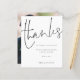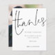 Elegant Script Photo Wedding Thank You. A budget price SMALLER 4.5” x 5.6” alternative. Available in a SEMI-GLOSS 110 lb CARD STOCK which is the default option (thicker for invitations), OR a SATIN FINISH 80 lb THINNER PAPER STOCK (ideal for enclosures). Envelopes are an optional extra and are slightly larger than the card size. . A minimalist typography design with a set stylish handwriting style script for Thanks. On the back replace the sample picture with your own favourite from your day as a keepsake for your guests. Easily personalise the rest of the text with your message and names.