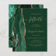 The left-hand edge of this elegant modern 50th anniversary party invitation features an emerald green watercolor agate border trimmed with faux gold glitter. The customizable text combines gold-colored handwriting, copperplate and italic fonts on a green background. The reverse side features a matching green and gold agate design.