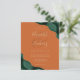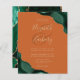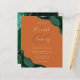 An emerald green watercolor agate design trimmed with faux gold glitter appears in two corners of this elegant design. Personalize it with the couple's names in gold-colored handwriting script over a large rust ampersand. Add the wedding details in gold-colored copperplate and italic fonts on a burnt orange background. The reverse side features a matching green and gold agate design.
