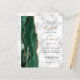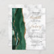 The left-hand edge of this elegant modern wedding invitation features an emerald green watercolor agate border trimmed with faux gold glitter. The customisable text combines gold-coloured handwriting script with black copperplate and italic fonts on a white and grey marble background. Add additional details to the back, along with a QR code to help guests visit your wedding website.
