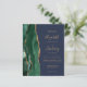 The left-hand edge of this elegant modern wedding invitation features an emerald green watercolor agate border trimmed with faux gold glitter. The customisable text combines gold-coloured handwriting, copperplate and italic fonts on a navy blue background. The reverse side provides space for wedding details on a solid navy blue background, along with a QR code guests can scan to visit your website and RSVP, which saves the cost of printing and mailing separate RSVP cards.