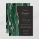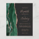 The left-hand edge of this elegant modern wedding invitation features an emerald green watercolor agate border trimmed with faux rose gold glitter. The customisable text combines rose pink handwriting, copperplate and italic fonts on a sable black background. The reverse side features a matching emerald green and rose gold agate design.