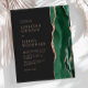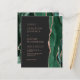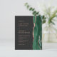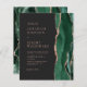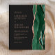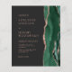 The right edge of this elegant modern wedding invitation features an emerald green watercolor agate border trimmed with faux rose gold glitter. The customisable text combines dusty rose pink serif, copperplate and italic fonts on a slate black background. The reverse side features a matching emerald green and rose gold agate design.