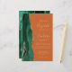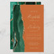 The left-hand edge of this elegant modern wedding invitation features an emerald green watercolor agate border trimmed with faux gold glitter. The customizable text combines gold-colored handwriting, copperplate and italic fonts on a burnt orange or rust background. The reverse side features a matching emerald green and gold agate design.