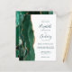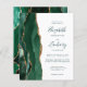 The left-hand edge of this elegant modern wedding invitation features an emerald green watercolor agate border trimmed with faux gold glitter. The customisable text combines whimsical handwriting script, copperplate and italic fonts in emerald green on a white background. The reverse side features a matching emerald green and gold agate design.