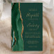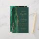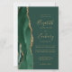 The left-hand edge of this elegant modern wedding invitation features an emerald green watercolor agate border trimmed with faux gold glitter. The customisable text combines gold-coloured handwriting, copperplate and italic fonts on a dark green background. The reverse side features a matching emerald green and gold agate design.