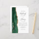 Save the cost of printing and mailing separate RSVP cards with this elegant modern all-in-one budget wedding invitation. The left-hand edge features an emerald green watercolor agate border trimmed with gold faux glitter. The customisable text combines charcoal grey handwriting, copperplate and italic fonts on a white background. The reverse side provides space for wedding details, along with a QR code guests can scan to visit your website and RSVP.
